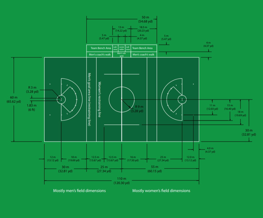 The field is 100 meters long and 50–60 meters wide. It is clearly marked with sidelines and end lines, with a center circle (draw area) used for starting play. In front of the goals there is a semicircular goal area (goal circle or crease) that provides special protection for the goalkeeper.